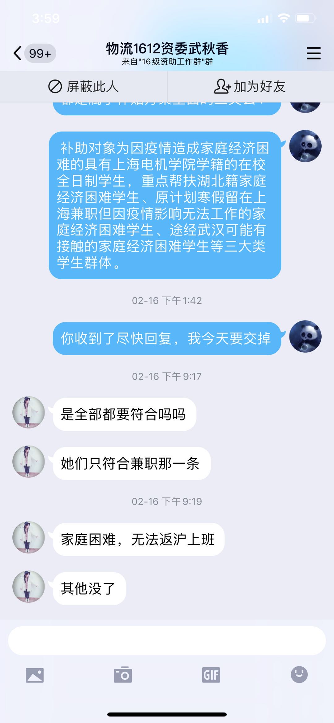 作为学院负责资助工作的辅导员张鹂,在疫情期间,坚持居家办公。并在疫情爆发最严重的时期,及时排摸beat365中文官方网站2800多名学生中因受疫情影响需要资助、需要帮助的同学。在了解每一位学生的状况之后,及时上报并发放困难补助,帮助每一位学生,每一个家庭渡过这次难关。资助工作在疫情期间是一项丝毫不能松懈的任务,只有精准的掌握每一位同学的生活情况,才能将资助工作做的更加细致,更加彻底。在做好各项资助工作的同时,她不忘积极宣传国家政策,挖掘资助育人成果也是必不可少的。在受资助的同学中,不乏有很多积极向上,并为这次防疫工作尽自己的一份力的同学。主动挖掘,积极宣传,把榜样的力量扩散到每一位同学的思想中,也是资助育人的关键。让我们共同努力,战胜疫情!