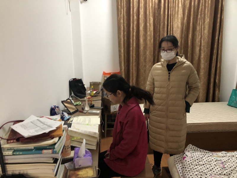 首先,两位老师来到研究生公寓(女生宿舍),逐一到女生寝室了解同学生活情况和留校原因,询问同学们对于留校期间是否遇到什么困难,以及生活上的诉求。关注留校生的心理,并及时给予了建议及疏导。同时就大四同学实习的问题,提出建议解决办法,可以先自己找好工作单位和面试好工作岗位,等疫情过去了,就以正常投入工作生活了。针对留学考试问题,提出可以自己在宿舍学习,由于国外疫情严重,可以缓一年再考虑出国,先实习一年,对出国留学也有一定的帮助。并且,提倡大家趁天气不错时,多多出宿舍到外面操场或者校园活动,同学之间相互交流,多锻炼,养成良好的生活作息。