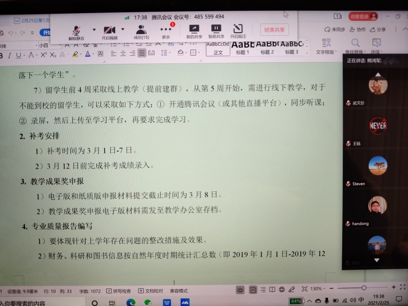 参会人员:教学办公室人员、各教研室主任、中外合作办公室主任、实验教学中心主任、学生办公室主任、教学副院长等。