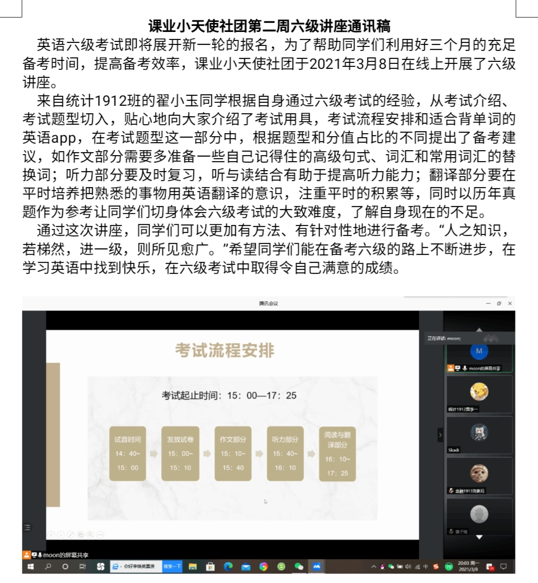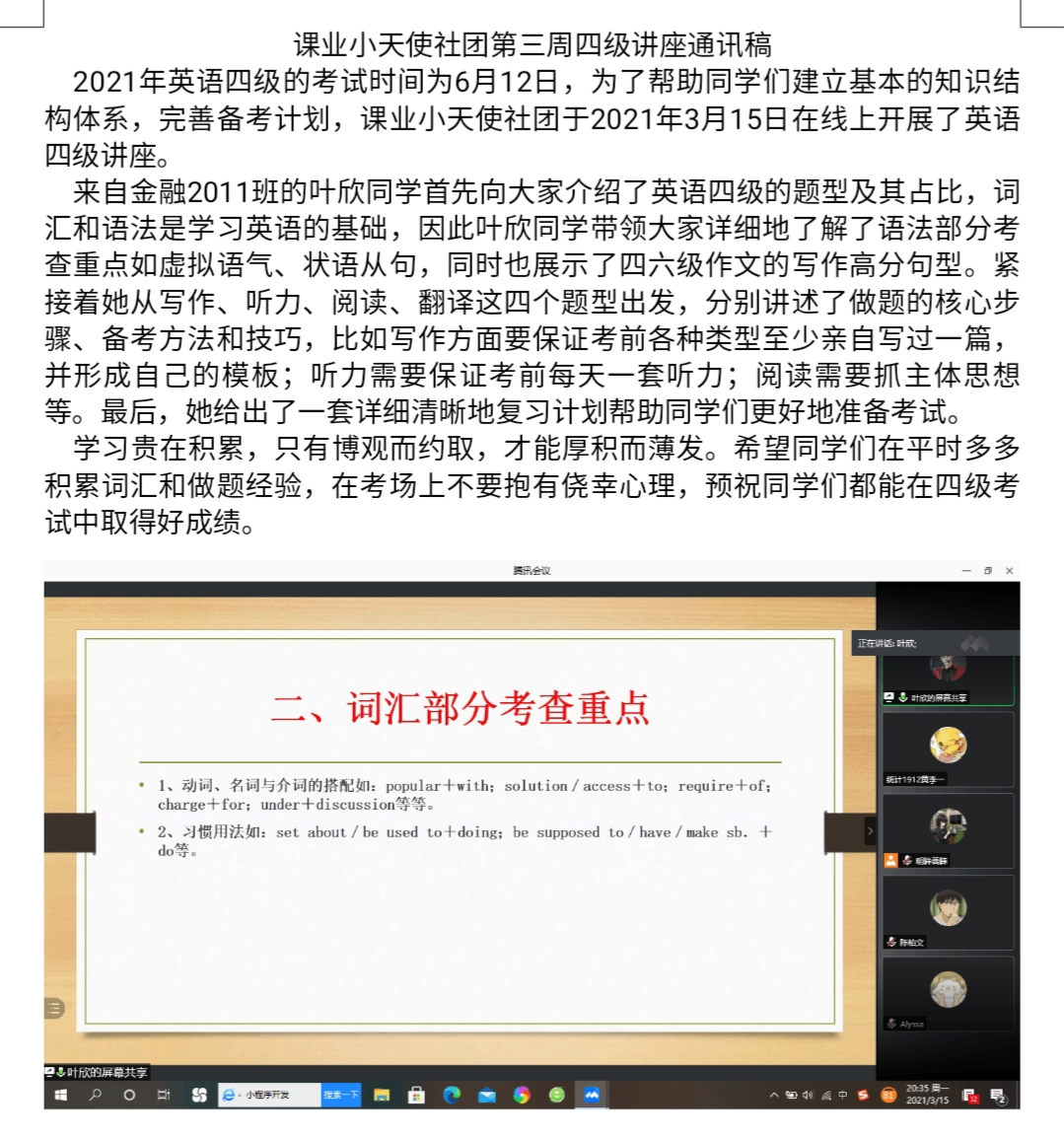 除此之外,为适应不同年级学生的需求,每周三我们会有针对大一学生开展的四级线上讲座,可以让闵行的同学参加,同时讲座由英语基础良好的大一同学开办,不仅锻炼了同学的英语水平,还锻炼了同学的口才和表达能力。希望通过接下来几周的社团活动,我们能够提高同学四六级通过率,提高英语的写作、翻译、阅读各个方面的水平,建设beat365中文官方网站良好学风。