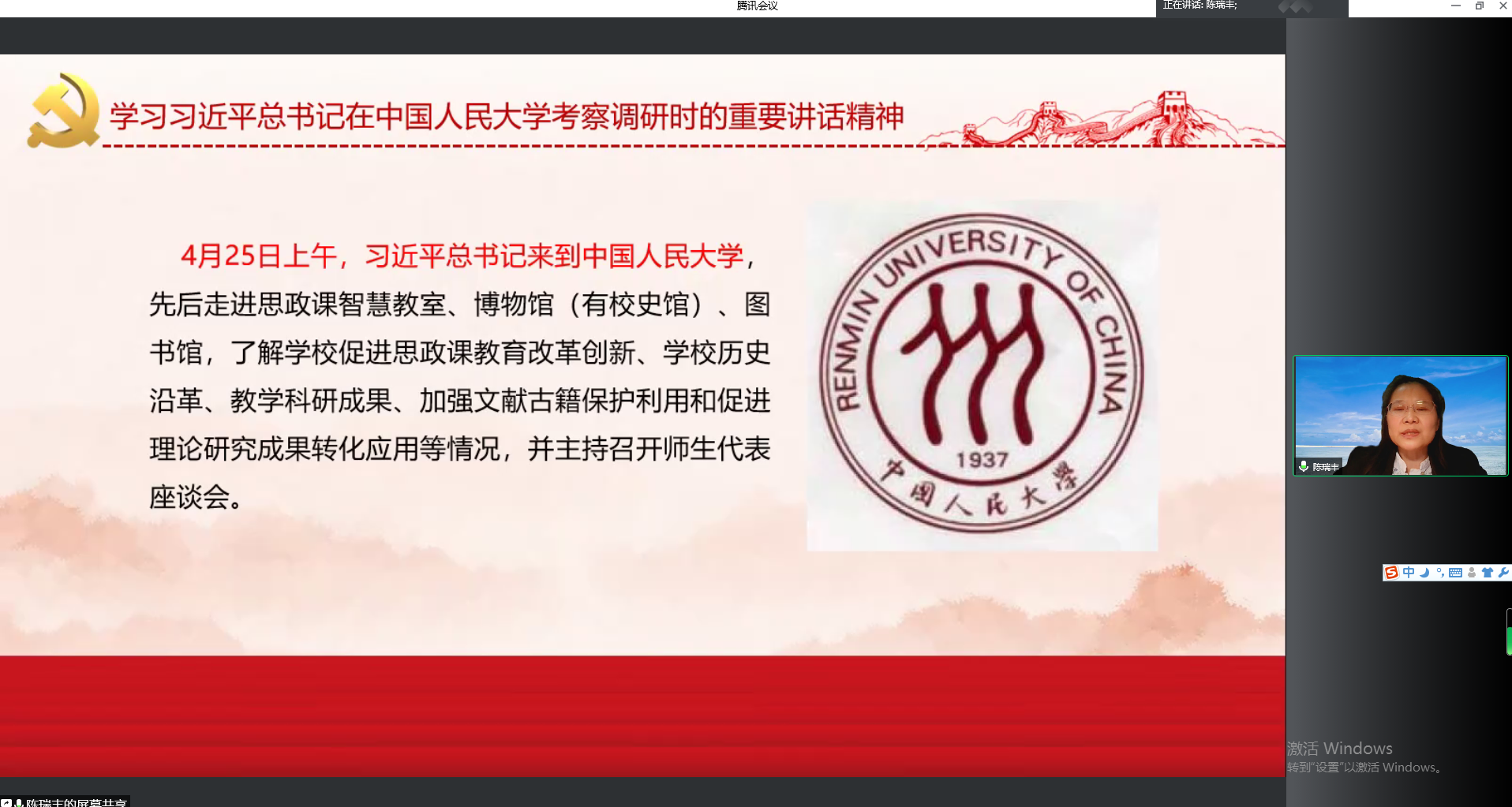 随后,陈瑞丰从“六个场景”、“三点总结”两个方面带领全体教师学习了习近平总书记在中国人民大学考察调研时的重要讲话精神。通过对习近平总书记考察思政课堂、博物馆、博物馆门前广场、图书馆、世纪馆北大厅、与师生挥手致意等六个场景的讲述,详细介绍了习近平总书记勉励同学们坚定“四个自信”,在全面建设社会主义现代化国家新征程中勇当开路先锋、争当事业闯将;号召师生讲好中国共产党的故事,守好党的重要阵地;激励广大师生继承优良传统,赓续红色血脉;希望中国青年能够立足新时代新征程,坚定不移听党话、跟党走,努力成长为堪当民族复兴重任的时代新人。结合学校实际,陈瑞丰提出为党育人、为国育才;以中国为观照、以时代为观照,严爱相济、润己泽人三点总结与老师们共勉,为建设中国特色、世界一流大学而共同努力。