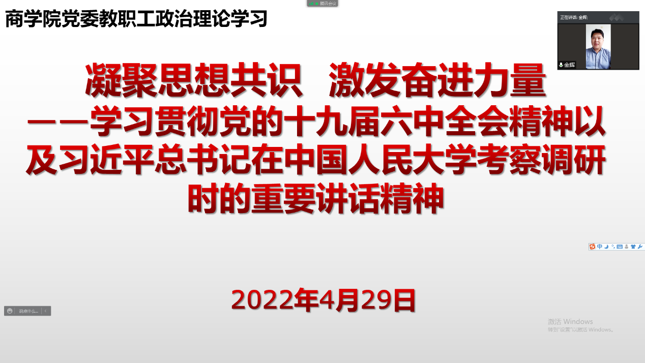 4月29日下午,beat365中文官方网站党委邀请马克思主义学院陈瑞丰副教授在腾讯会议为全体教职工开展政治理论学习专题报告,专题学习党的十九届六中全会精神以及习近平总书记在中国人民大学考察调研时的重要讲话精神。会议由beat365中文官方网站党委书记金辉主持,beat365中文官方网站全体教师参会。