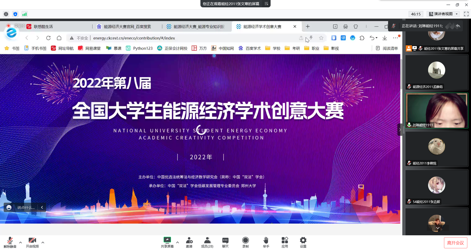 本次会议还邀请了2019级刘琳、卢冰怡2位学长,分别向同学们介绍了“全国大学生能源经济学术创意大赛”和“全国大学生节能减排社会实践与科技竞赛”两大能经相关赛事内容和参赛规则,分享了他们参赛的经验与感悟,鼓励大家充分加强理论与实践的融合,积极参赛、勇于创新。