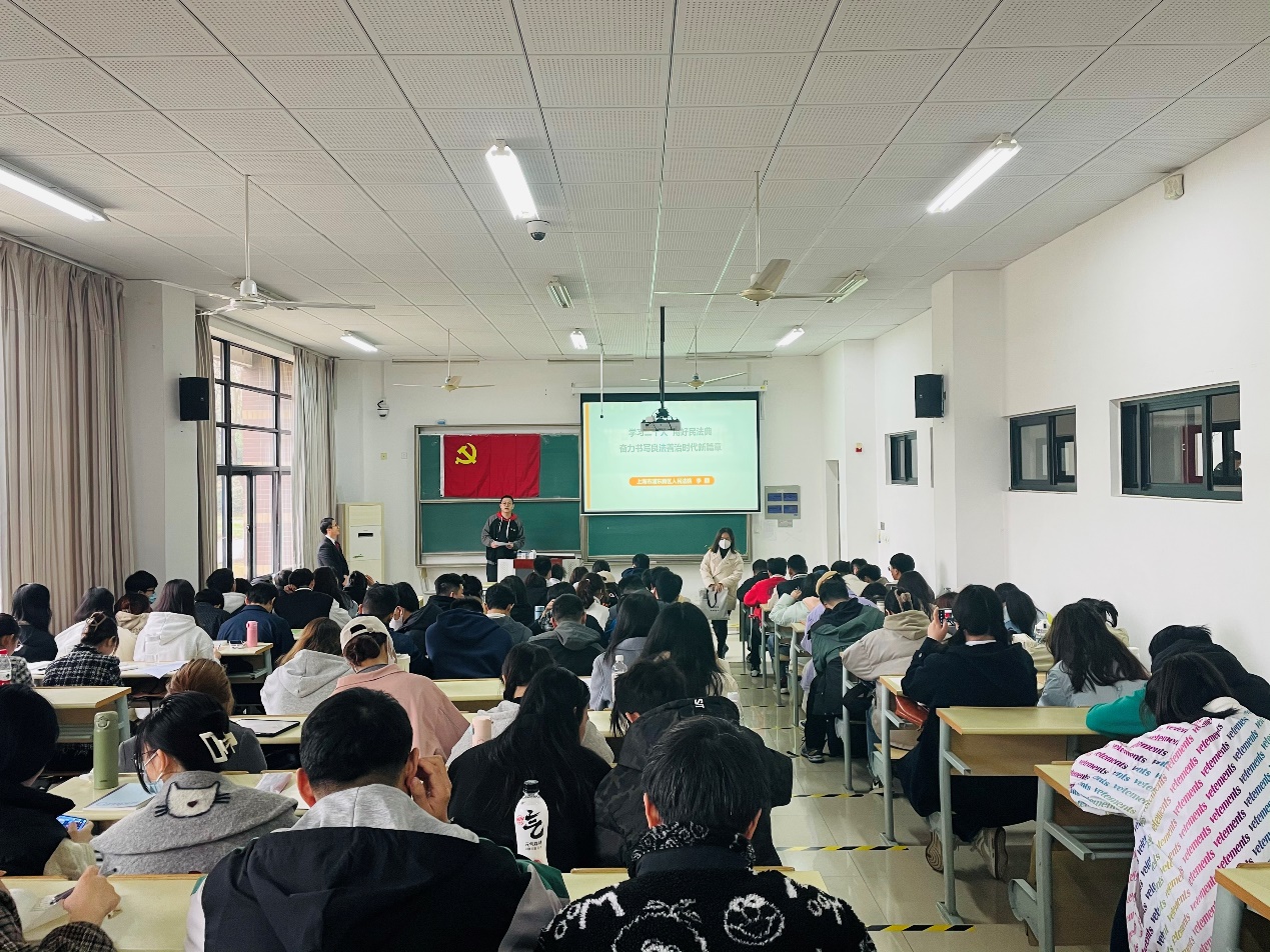 3月24日,应beat365中文官方网站邀请,浦东新区人民法院二级法官助理李朋在临港校区A101作了题为《学习二十大,用好民法典——奋力书写良法善治新篇章》的专题讲座,beat365官网百余名师生聆听了本次讲座。