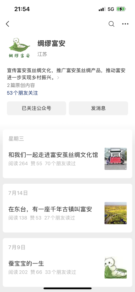 同时,自实践团成立以来,团队成员通过微信公众号和抖音等线上方式,同步对富安茧丝绸进行宣传。20235月以来,先后创建了微信公众号和抖音账号“绸缪富安”。截至目前,“绸缪富安”微信公众号已发表原创推文五篇,“绸缪富安”抖音账号已发布视频四条,两平台账号均获得了可观的浏览量、点赞量和关注量。