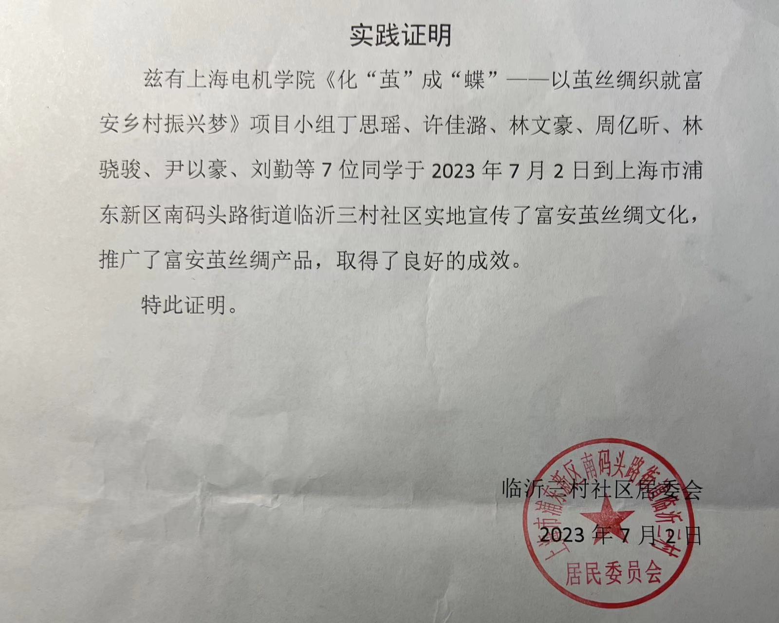 2023年6月-8月间,实践团成员分为三组,先后前往上海市浦东新区海霞社区、依水园社区、临沂三村社区、申江豪城社区、静安区三乐里社区、嘉定区嘉呈社区、奉贤区银河社区、松江区菜花泾社区、青浦区青东农场社区、金山区红菱社区等十二个区的十七个居民社区和普陀区真如高陵集市、浦东新区芦恒路中欧街集市、嘉定区南翔镇幻月集市等三个集市进行暑期社会实践。通过现场讲解、摆放展架、展示和销售富安茧丝绸产品等方式宣传富安茧丝绸文化,推广富安茧丝绸产品,取得了良好的成效,获得了多个社区和机构的认可和肯定。