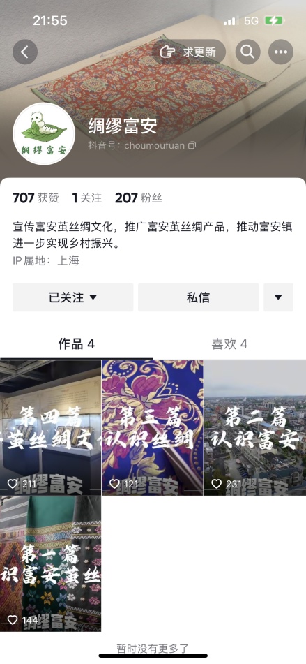 同时,自实践团成立以来,团队成员通过微信公众号和抖音等线上方式,同步对富安茧丝绸进行宣传。2023年5月以来,先后创建了微信公众号和抖音账号“绸缪富安”。截至目前,“绸缪富安”微信公众号已发表原创推文五篇,“绸缪富安”抖音账号已发布视频四条,两平台账号均获得了可观的浏览量、点赞量和关注量。
