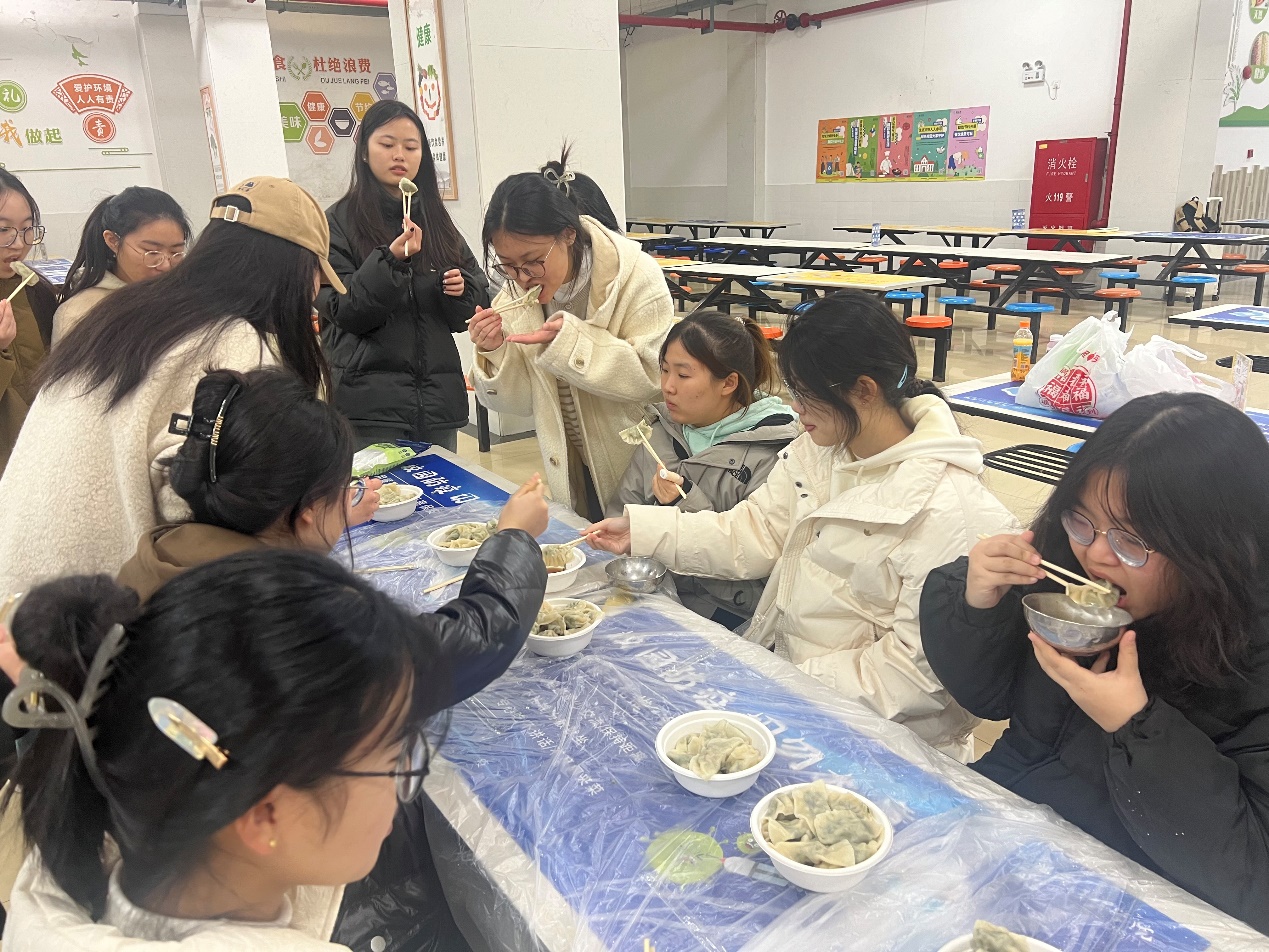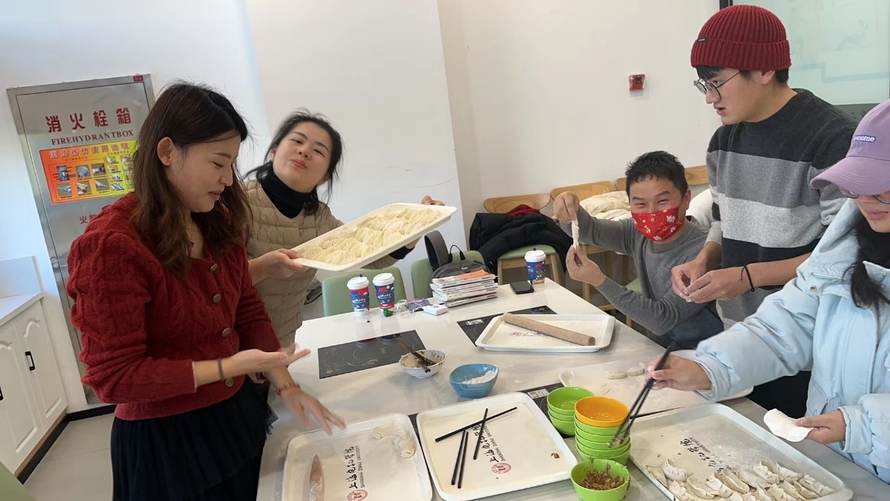 餐厅里、活动室里,来自五湖四海的同学聚在一起,师生们围在一起话家常、包饺子,分享家乡的冬至习俗,大家忙得不亦乐乎。有经验的老师们亲自示范擀皮、包馅,与同学们分享劳动成果的喜悦,并了解同学们的学习情况和生活情况,向同学们送上最温暖的祝福,希望大家考取优异的成绩。在饺子展示环节,桑子轶老师的水饺受到大家的一致好评。有的同学对着视频教程,现学现包,看着自己包的造型各异的饺子,自嘲道,“不管包得怎么样,自己做的,怎么都好吃”,欢声笑语顿时充满整个房间。