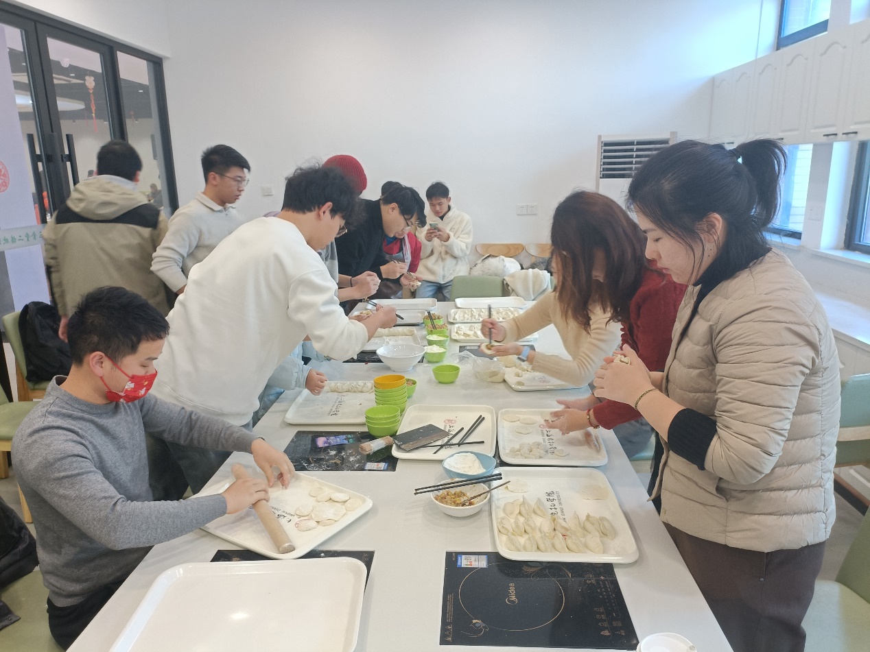 餐厅里、活动室里,来自五湖四海的同学聚在一起,师生们围在一起话家常、包饺子,分享家乡的冬至习俗,大家忙得不亦乐乎。有经验的老师们亲自示范擀皮、包馅,与同学们分享劳动成果的喜悦,并了解同学们的学习情况和生活情况,向同学们送上最温暖的祝福,希望大家考取优异的成绩。在饺子展示环节,桑子轶老师的水饺受到大家的一致好评。有的同学对着视频教程,现学现包,看着自己包的造型各异的饺子,自嘲道,“不管包得怎么样,自己做的,怎么都好吃”,欢声笑语顿时充满整个房间。