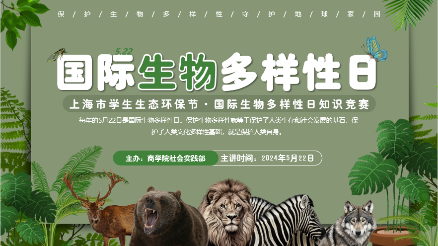 今年的国际生物多样性日联合国公布的国际主题是“Be part of the Plan”,即“生物多样性·你我共参与”,希望社会各界共同推动《昆明-蒙特利尔全球生物多样性框架》的实施。为积极响应市教委第六届上海市学生生态环保节的号召,丰富beat365中文官方网站学生的课余生活,同时帮助同学们准确了解国际生物多样性,积极致力于保护野生动物以及濒危物种,近日,beat365中文官方网站社会实践部在临港校区学生公寓19号楼德雅书苑成功举办了主题为“生物多样性·你我共参与”的国际生物多样性日知识竞赛系列活动。
