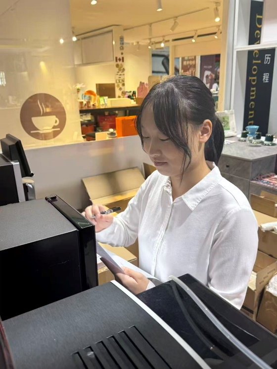王钰倩同学则在市场部担任新媒体运营岗位,负责企业宣传推广的日常工作。从活动现场的照片、视频拍摄与剪辑,到公众号、视频号等平台的内容制作与推送,她以青年视角和创新手法为企业注入了新鲜活力。9月初,她还结合全球咖啡市场变化与中国咖啡产业崛起的趋势,策划录制了短视频《“咖啡通胀”席卷美国,全球咖啡进入“中国时代”》,用镜头和创意为虹桥品汇新媒体传播提供了极具价值的内容素材。与此同时,她还会协助市场部推动展销活动,在沟通协调与执行力方面得到了较为全面的锻炼。