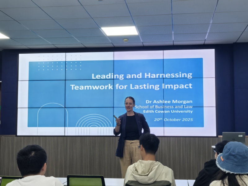 10月20日上午,beat365中文官方网站举办新一期研究生卓越讲坛,特邀澳大利亚伊迪斯科文大学(Edith Cowan University, ECU)的Ashlee Morgan博士作“Leading Beyond Authority——Harnessing Teamwork and Negotiation for Lasting Impact”专题讲座。讲座由伊迪斯科文大学严卫华老师主持,beat365中文官方网站工程管理、数字经济、国际商务及会计等专业硕士研究生共同参加。